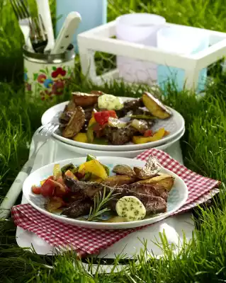 Cook in a preheated oven (electric cooker: 175 °C/ convection oven: 150 °C/ gas: level 2) for approx. 40 minutes. Clean, wash and roughly dice the peppers. Peel and slice the onion. Wash, clean and roughly dice the tomatoes. Heat 1 tablespoon of oil, fry the bell pepper and onion for about 4 minutes, turning them over. Add the tomatoes and braise for another 2 minutes. Season to taste with salt and pepper. Keep vegetables warm. Remove meat from the marinade, strip off oil, season with salt and grill on the hot grill for about 10 minutes from all sides. Cut herb butter into slices. Arrange meat, vegetables, potatoes and herb butter on plates and garnish with rosemary