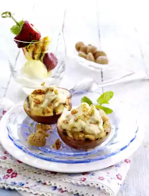 Grill the nectarines and skewers for about 3 minutes while turning. Fill nectarines with mascarpone cream and arrange on plates. Decorate with mint and Amarettini. Arrange strawberry skewers in 4 glasses on a ball of vanilla ice cream.