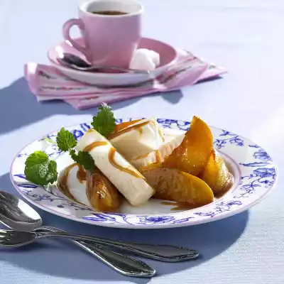 Turn out the parfait from the mould and cut 6 slices (approx. 2 cm wide). Cover the rest of the parfait immediately and freeze. Cut parfait slices into strips, arrange with peaches and caramel sauce.