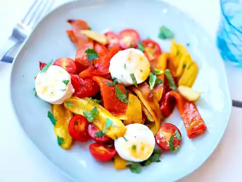 Remove the peppers from the bag, peel the skin and cut the flesh lengthwise into strips. Serve with cherry tomatoes and goat cheese. Drizzle with the dressing.