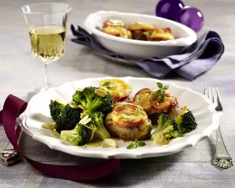 Sprinkle with a part of the marjoram and cover with slices of tomato and cheese. Cook broccoli in salted water for 4-5 minutes. Meanwhile, gratinate the meat under the grill for 3-4 minutes. Drain broccoli. Roast almonds in a pan without fat, then add butter and melt.