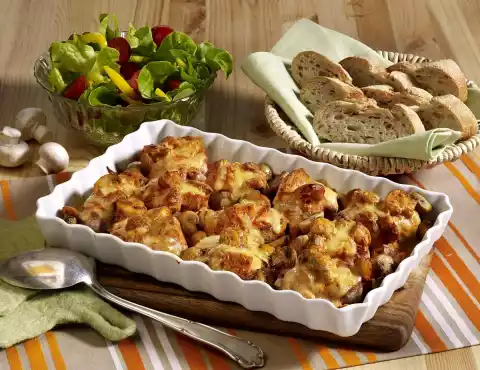 Season to taste with salt. Put the meat and mushroom pan in a greased casserole dish. Sprinkle with cheese. Bake in a preheated oven (electric cooker: 200 °C/ convection oven: 175 °C/ gas: level 3) for 10-15 minutes.