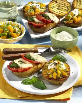 Drain the potatoes, let them cool down a little and cut them in half. Cover 6 halves with basil leaves, tomatoes and mozzarella. Sprinkle with salt and pepper. Spread the apricot-leek-onion mixture on the remaining potato halves.