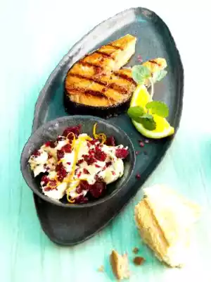 Brush salmon chops with oil. Grill them on the hot charcoal grill from both sides for about 3 minutes. Season salmon chops with salt and pink pepper. Serve with cranberry-mustard butter and garnish with mint and orange.