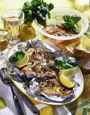 Cover and leave to marinate in the fridge for about 2 hours. Salt the salmon pieces and place each on a piece of oiled aluminium foil. Beat the edges upwards. Cook the packs on the hot grill for about 10 minutes. (In the oven under the preheated grill for 6-8 minutes). Garnish with fresh herbs and lemon wedges and serve with baguette. Serve with a colourful salad