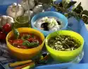Peel and slice the garlic. Wash thyme and basil and dab dry. Remove the thyme leaves. Cut basil leaves into strips. Squeeze lemon (3-4 tablespoons) and mix with basil oil. Cut salmon fillet into 4-6 slices and place in a bowl. Sprinkle with garlic, herbs and pepper and pour lemon-oil mixture over it.