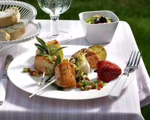Roast the pine nuts in a pan without fat until golden brown, take them out. Mix the prepared ingredients, chilli sauce, 2 tablespoons of olive oil and vinegar. Season to taste with salt and pepper. Cook skewers on the hot grill while turning for about 10 minutes. Season with pepper. Arrange skewers and sauce on plates. Tastes good with fresh bread and grilled vegetables