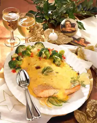 Cover and cook in 3/8 litres of boiling salted water for 8-10 minutes. Remove fish from the cooking water and drain well. Place in an ovenproof dish, pour sauce over it and bake in a preheated oven (electric cooker: 200 °C/ gas: