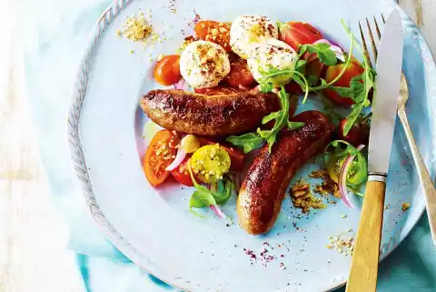 Fold the salad into the tomato salad and serve with the sausages. Sprinkle with the nut and spice mixture. Flat bread tastes good with it - also briefly grilled if desired.