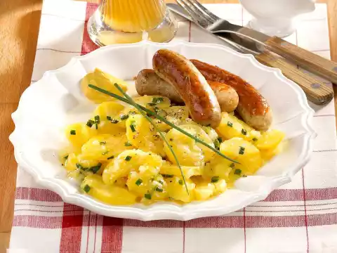 Fry the sausages in 2 tablespoons of hot oil until golden brown all around. Wash the chives, chop finely and fold into the potato salad. Season salad to taste. Arrange everything