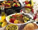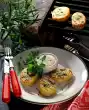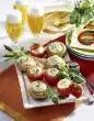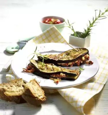 Dab aubergine slices. Spread feta cream on top. Roll up and pin with wooden skewers. Brush with remaining rosemary oil, season with pepper. Grill on the hot grill (preferably in a grill tray) for 3-4 minutes on each side. Add the paprika dip. Bread tastes good with it