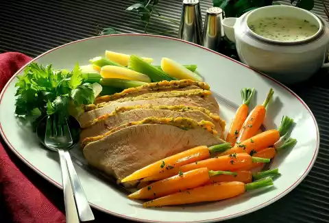Deglaze with 1/4 litre of the meat stock and cream and bring to the boil while stirring. Season to taste with horseradish, salt and pepper. Wash the chives, cut into fine rolls and stir in. Arrange meat and vegetables on a plate.