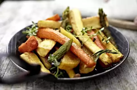 Close the tin with aluminium foil and bake in a hot oven for about 20 minutes. Then remove the foil and continue baking for 10-15 minutes until the vegetables are soft.