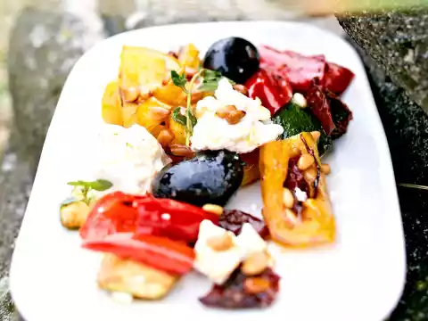Preheat oven (electric cooker: 175 °C/circulating air: 150 °C/gas: see manufacturer). Wash thyme, shake dry, chop. Chop tomatoes smaller. Mix vegetables, olives, tomatoes, thyme, pine nuts and 2 tbsp. oil in an ovenproof dish.