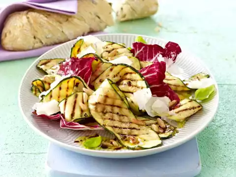 Carefully mix the radicchio, remaining basil and pine nuts with the marinated zucchini slices. Arrange the salad on a large plate and sprinkle with parmesan slices and basil. Serve with fresh bread (e.g. olive ciabatta)