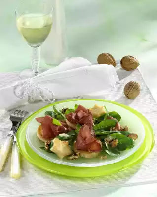 Mix with oil, vinegar, walnuts and stock. Season to taste with salt and pepper. Spread Bündner meat on the toast circles. With salad and toast stars. Drizzle the salad with the lukewarm vinaigrette.
