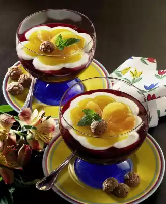 Stir the quark, yoghurt and milk until smooth. Season to taste with vanilla sugar and lemon juice. Drain the apricots. Put 4 halves aside, mash the rest. Refine with amaretto. Fill red fruit jelly into dessert glasses.