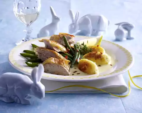 Put ham in a pan, add beans and toss briefly. In the meantime heat clarified butter in a large pan and fry the gnocchi in it for about 3 minutes. Take the guinea fowl out of the oven and cut them into pieces.