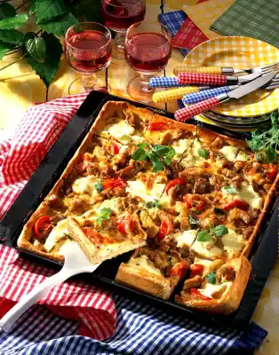 Add crème fraîche as a blob and sprinkle with grated cheese. Bake in the preheated oven on the lowest rack (electric oven: 200 °C/ gas: level 3) for 35-40 minutes. Cut into approx. 16 pieces and serve sprinkled with oregano flakes and garnished as desired.