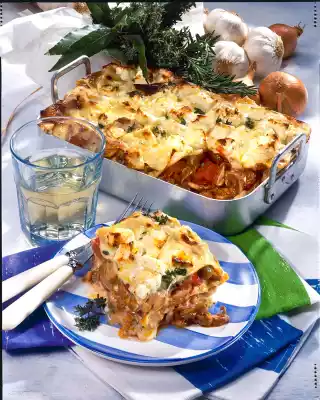 Wash and pluck the thyme and sprinkle it on the lasagne. Bake in the preheated oven (electric cooker: 200 °C / convection oven: 175 °C/ gas: level 3) for approx. 45 minutes until golden brown
