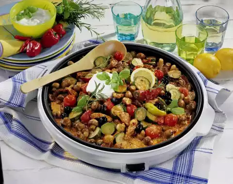 Peel and chop the onions. Clean and wash the tomatoes and mushrooms, possibly halve them. Clean, wash and cut the zucchini into pieces. Heat oil in a large pan. Fry the gyros in it over a high heat for about 5 minutes, turning them over, and push them to the edge of the pan. Fry the mushrooms, onions and courgettes in the frying fat.