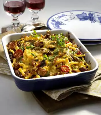 Bring to the boil, stir in stock and simmer for 2-3 minutes. Season with salt and pepper. Layer noodles, sauce and cheese alternately in an ovenproof dish. Finish with cheese. Bake in a preheated oven (electric cooker: 200 °C/ convection oven: 175 °C/ gas: level 3) for 15-20 minutes. Serve garnished with marjoram