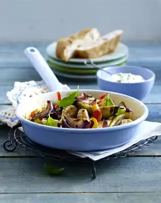 Clean and wash the zucchini, cut them in half lengthwise and cut into pieces. Clean, wash and cut the peppers into strips. Wash chicken fillets, dab dry and cut into strips. Season meat with salt and gyros spice.