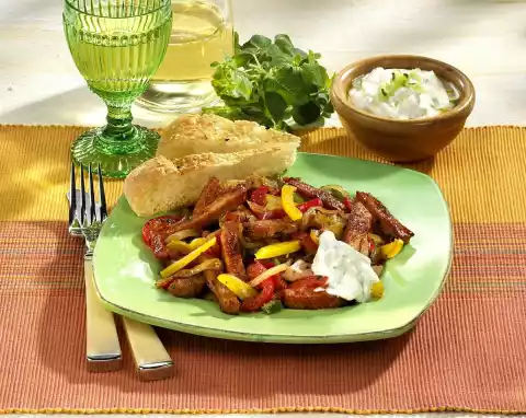 Cut the meatloaf into strips. Mix the gyros spice, meat loaf and 1 tablespoon of oil and leave to stand for 5 minutes. Clean, wash and cut the peppers into strips. Peel and quarter onion and cut into thin strips.