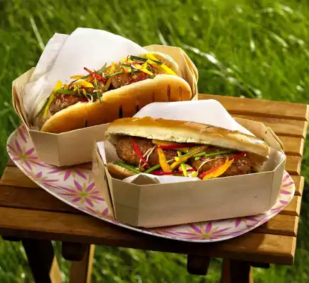 Strip rosemary needles from the stalks. Wash the chives, cut them into 2-3 cm long pieces. Mix paprika, rosemary, chives, sprouts and cashew nuts with some lemon juice. Cook the meatballs on the hot grill while turning for about 7 minutes. Heat the hot dog buns on the grill for approx. 2 minutes on each side. Cut the rolls from one side and fill them with meatballs, vegetable-herbal mixture and some asian sauce