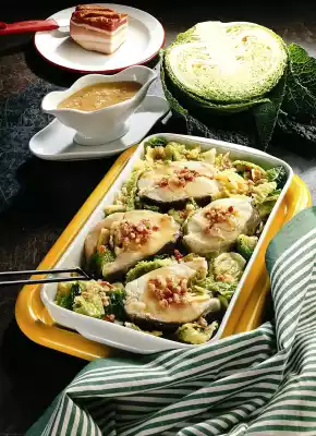 With water to 1/2 liter. Pour into the bacon, bring to the boil and sprinkle roux. Let it boil for 1 minute. Season to taste again. Arrange fish chops on the cabbage and pour some of the sauce over them.