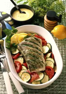 Layer tomatoes and zucchini and season with salt and pepper. Cover the mould. Pre-cook vegetables for seven to eight minutes at 650 watts. In the meantime, cut the fish skin diagonally with a sharp knife and spread the soft herb butter into the incisions.