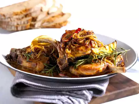 Peel onions and cut them into rings. Wash the rosemary and chop coarsely, except for a little to garnish. Wash the lemon, rub dry and cut into slices. Wash chops, dab dry. If necessary, cut some of the meat free from the bone ends.