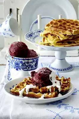 For the sauce, mix sour cream, vanilla and 1 tablespoon of sugar. Serve with the waffles. Serve with ice cream.