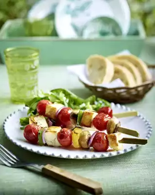 Wash the tomatoes and grate them dry. Clean the mushrooms and cut off the stalk if necessary. Peel onions, cut them in half, divide them into thirds and cut off the pointed ends. Peppers clean, wash and cut into squares. Make sure that the pieces of all ingredients have the same size. Put the ingredients in any order on skewers (approx. 14 cm long), always putting 3 tomatoes, 2 mushrooms, 2 cheese cubes, pepper and onion pieces on a skewer