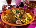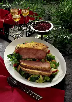 Let cabbage drip off. Heat the fat in a pan and fry the apples briefly. Add the savoy cabbage and toss briefly. Season with nutmeg. Cut the ham and arrange it on the savoy cabbage on a plate. Garnish with parsley and laurel. Cranberry compote tastes good with it