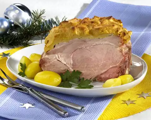 Take the ham out of the stock. Remove fat edge and rind. Mix mustard, breadcrumbs, sugar and eggs and spread on the ham. Bake in the preheated oven (electric cooker: 200 °C/ convection oven: 175 °C/ gas: level 3) for approx. 30 minutes until golden brown.