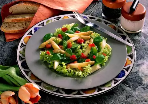 Cook the asparagus for 8-10 minutes. After about 5 minutes add the sugar snap peas. Drain the vegetables and let them drain. Clean and wash the salad and pluck into bite-sized pieces. Mix vinegar with salt, pepper and sugar.