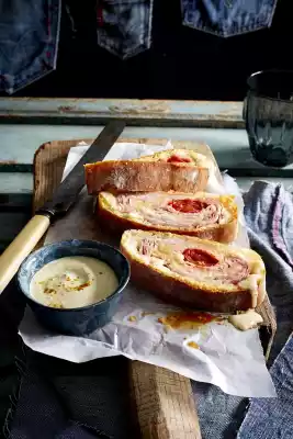 Dust with curry. Cut the finished ham and cheese roll into slices. Tastes hot and cold.