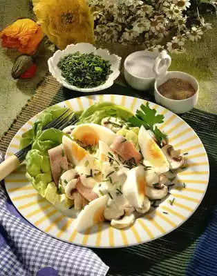 Cut the ham into strips. Clean, wash and slice the mushrooms. Clean, wash and dry lettuce well