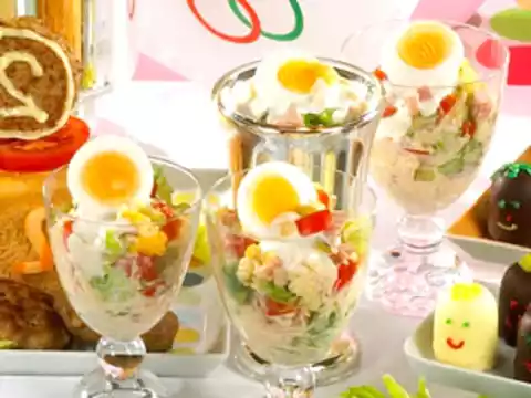 Mix the prepared salad ingredients, except for the egg slices. Cover and leave to stand for at least 30 minutes. Season again and arrange in large stem glasses (goblets). Garnish with slices of egg