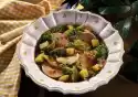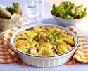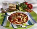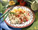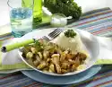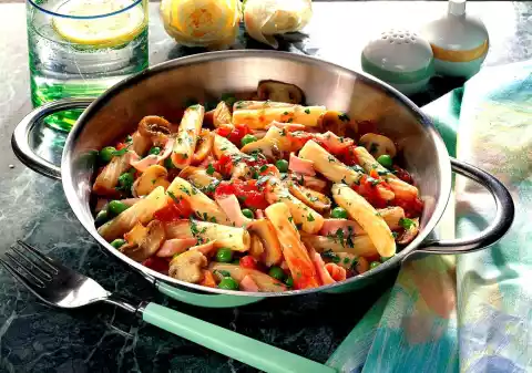 Cook the pasta in boiling salted water for about 10 minutes. Peel and chop the onion and fry in hot oil. Wash, clean and chop the mushrooms and fry them briefly. Stir in tomato pieces, stock, peas and herbs.