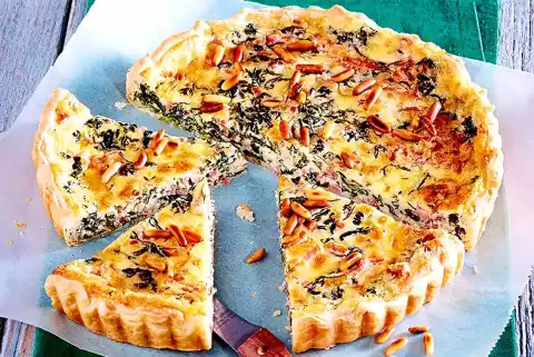 Whisk eggs, cream and cheese. Stir in pine nuts and diced ham. Season with salt, pepper and nutmeg. Spread the spinach on the dough. Pour egg cream over it. Bake the tart in the preheated oven (electric oven: 200 °C/circulating air: 180 °C/gas: see manufacturer) on the lowest shelf for approx. 30 minutes.