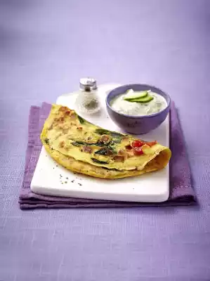 Heat oil in a small coated pan. Sauté the vegetables for about 2 minutes while turning, add ham and eggs. Leave to set on a low heat for about 5 minutes. Fold the omelette and serve with the cucumber quark