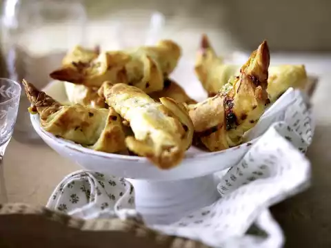 Cut each strip into 3 rectangles of the same size and halve them diagonally. Spread the filling over the triangles and sprinkle with cheese. Roll up the puff pastry from the long side to the top and place on a baking tray lined with baking paper.
