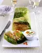 Clean, wash, shake dry and cut rocket into very fine strips. Season vinegar with salt, pepper and 1 pinch of sugar. Fold in 3 tablespoons of oil. Mix salad and vinaigrette and spread on small glasses or plates.