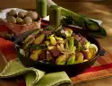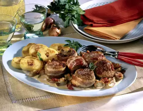 Deglaze with stock, cream and white wine and bring to the boil. Stir starch with 1 tablespoon of water until smooth, thicken stock with it. Bring the sauce to the boil again, season to taste with salt and pepper. Serve medallions, dumpling slices, sauce and bacon strips garnished with marjoram.