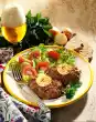 Heat 1 tablespoon of oil and fry the medallions on both sides over medium heat. In the meantime, form dumpling dough into a roll and cut into slices. Press a crouton into each slice.