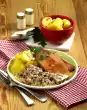 Season with salt and pepper. Divide the minced meat into 12 portions, shape slightly oblong. Place on 1 slice of ham and roll up. Peel, wash and cut the potatoes into pieces. Cook in boiling salted water for about 20 minutes.