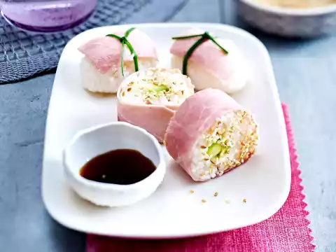 Roast sesame seeds in a pan without fat. Let it cool down on a plate. Remove the foil from the ham nigiri and cut the rolls into about 10 pieces each. Turn the cut surfaces in sesame seeds. Serve nigiris and makis with soy sauce