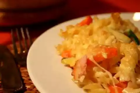 Layer the boiled pasta in layers with the sliced ham in the greased casserole dish (the last layer of pasta). Pour the cream-egg-salt mixture over them. Sprinkle with cheese and breadcrumbs.